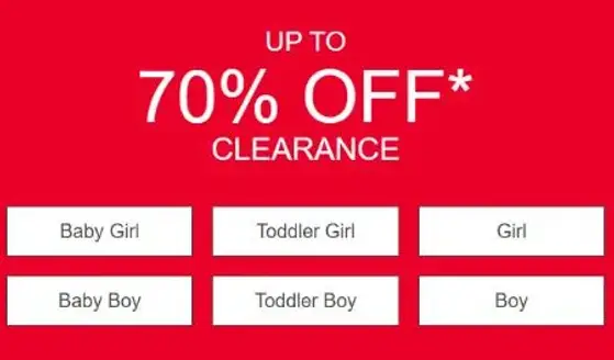 Up to 70% Off Clearance & More: Savings based on MSRP or original ticketed price. Excludes Little Planet®, Skip Hop®, Otter Avenue™, PurelySoft™, Carter’s Bedtime™, swimwear, select new arrivals, select licensed styles, select outerwear, sneak peek snd doorbusters. Other exclusions may apply.